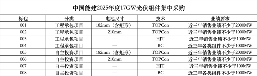 在业绩要求方面,对于TOPCon和HJT标段,无论业绩要求2GW、1GW还是100MW,都限定在该技术路线上;但对于BC标段,本次招标只要求相关企业“各类型组件销售业绩不少于1000MW”。这意味着,即使组件企业的BC产品暂未量产供货,之前的销售都是TOPCon,也可以先投标,确保入围企业数量。