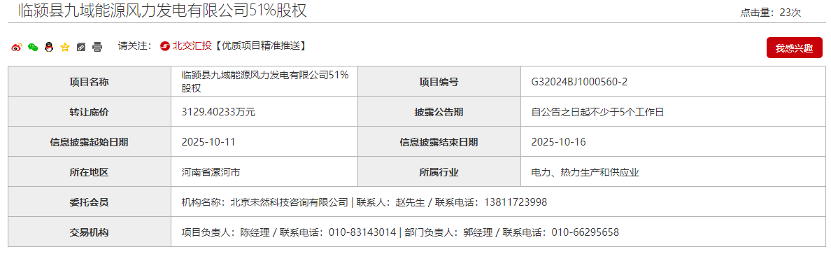 其中,包括临颍县九域能源风力发电有限公司51%股权,转让底价3129.40233万元;