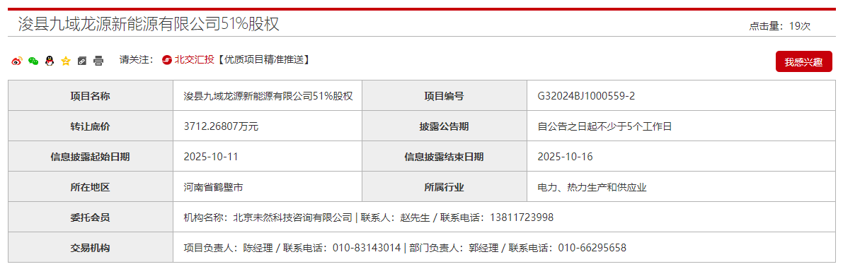 浚县九域龙源新能源有限公司51%股权,转让底价3712.26807万元;