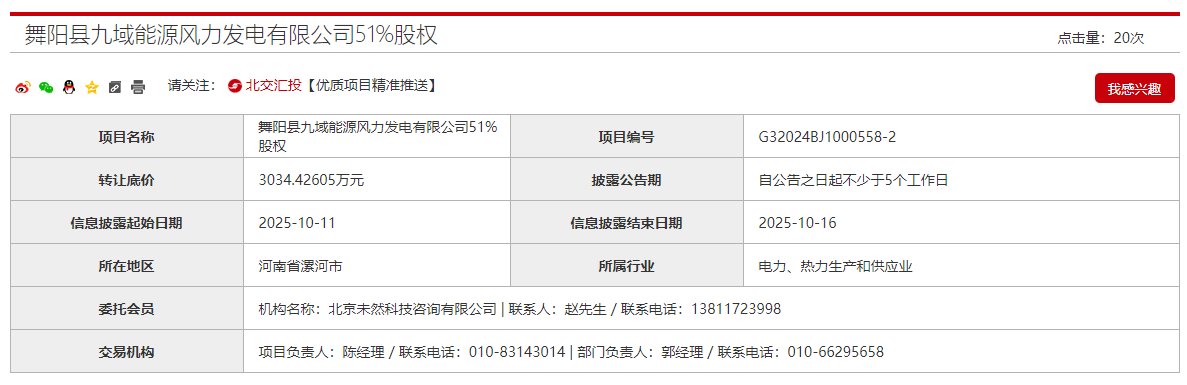 舞阳县九域能源风力发电有限公司51%股权,转让底价3034.42605万元。