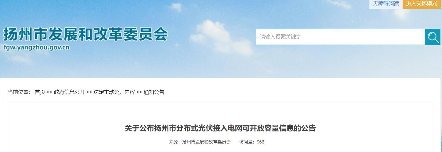 10月10日,扬州市发展和改革委员会公布扬州市分布式光伏接入电网可开放容量信息的公告。