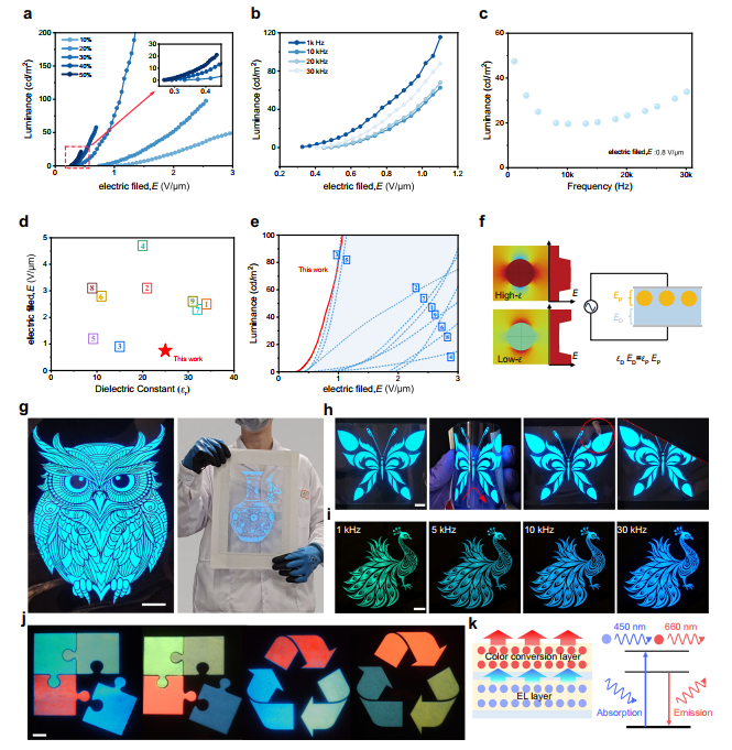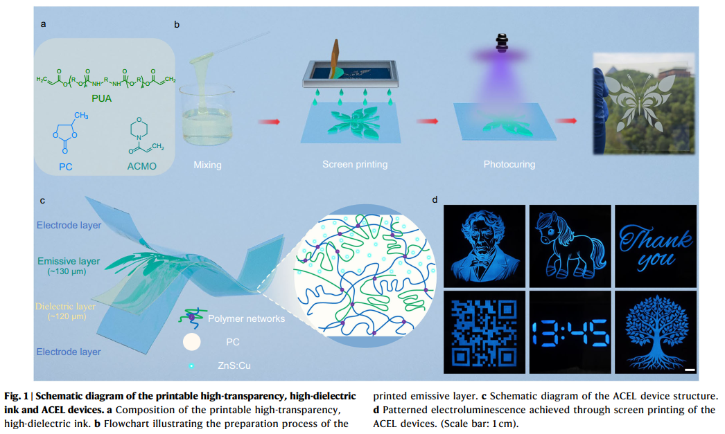 柔性交流电致发光器件将发光与机械柔性相结合,在可穿戴设备、软机器人和人机接口领域具有广阔应用前景。以往通常通过引入高介电填料(如BaTiO₃、液态金属、离子液体)来降低驱动电压,但这些异质填料的加入往往会损害器件的透明度和图案清晰度,且实现特定发光图案常依赖于光刻或3D打印等复杂工艺,抬高了技术门槛和制造成本。