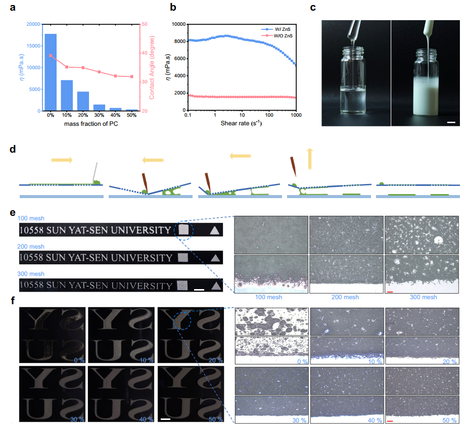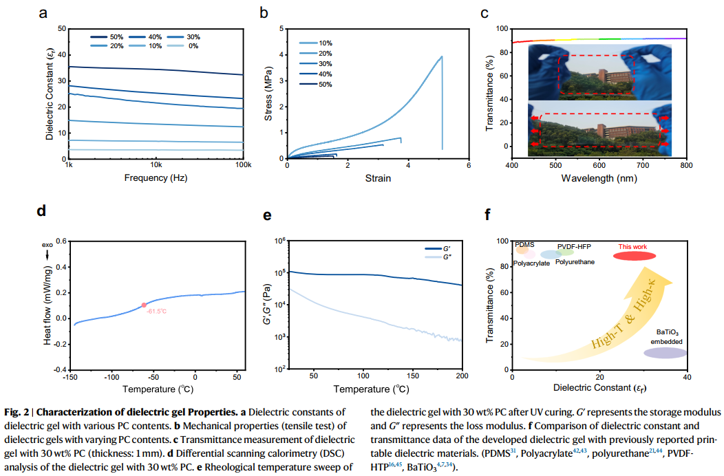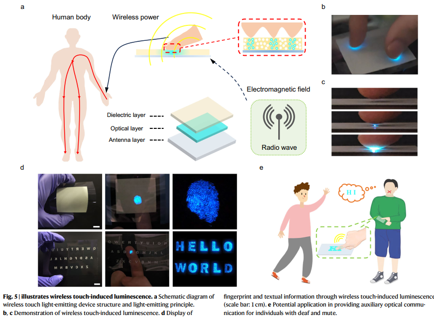 本研究的核心创新在于开发了一种均质、高透明、高介电的墨水,它巧妙地利用高介电小分子PC作为溶剂,从根本上解决了传统异质填料导致的透明度与介电性能难以兼顾的难题;结合丝网印刷工艺,该墨水实现了低成本、高分辨率的图案化制造,并成功演示了无需芯片与电池、通过人体耦合即可工作的无线触摸发光器件,为下一代柔性光电子与人机交互应用提供了全新的材料与技术平台。