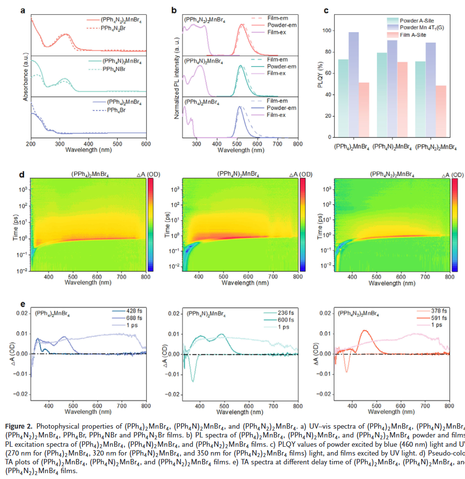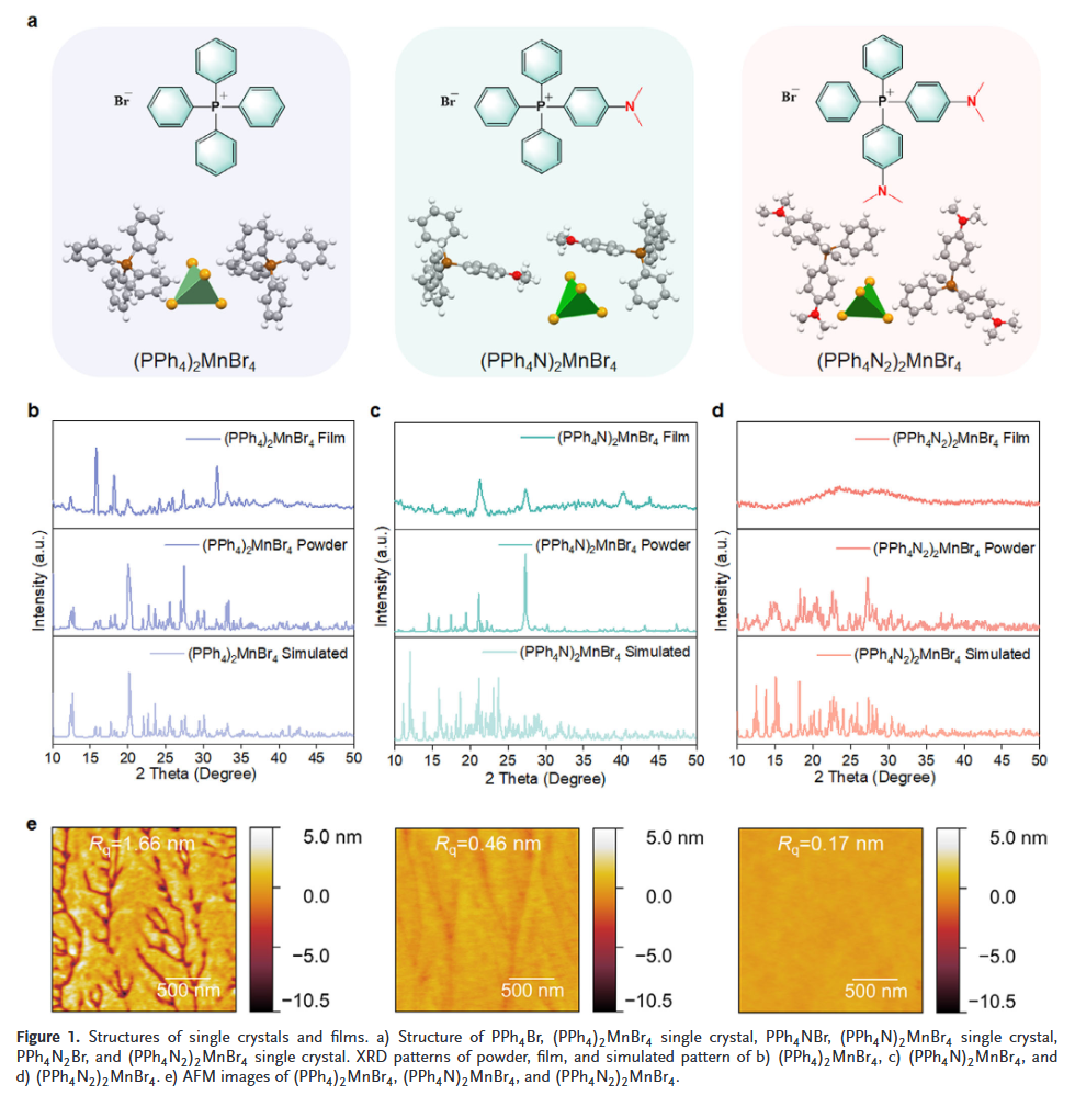 本文北京化工大学赵彪和谭占鳌等人揭示了A位阳离子在锰溴化合物中的光物理功能,并设计了二甲氨基功能化的A位阳离子,以调控声子动力学、薄膜形貌和能级排列,从而在溶液加工的绿光无铅金属卤化物器件中实现了前所未有的效率。适当在苯环上引入二甲氨基不仅构建了p-π共轭,增强了PPh₄⁺ A位阳离子的刚性,还削弱了有害的范德华相互作用,从而抑制了与A位相关的非辐射复合。重要的是,二甲氨基中的甲基增强了A位阳离子的柔性,抑制了晶界形成。此外,二甲氨基还调节了PPh₄⁺的能级,降低了电荷注入势垒。