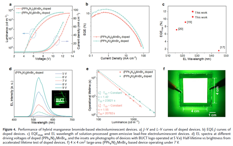 最终,所制备的电致发光器件实现了12.0%的最大外量子效率(EQE)和4×4 cm²的大面积发光,显示出其在下一代显示技术中的应用潜力。