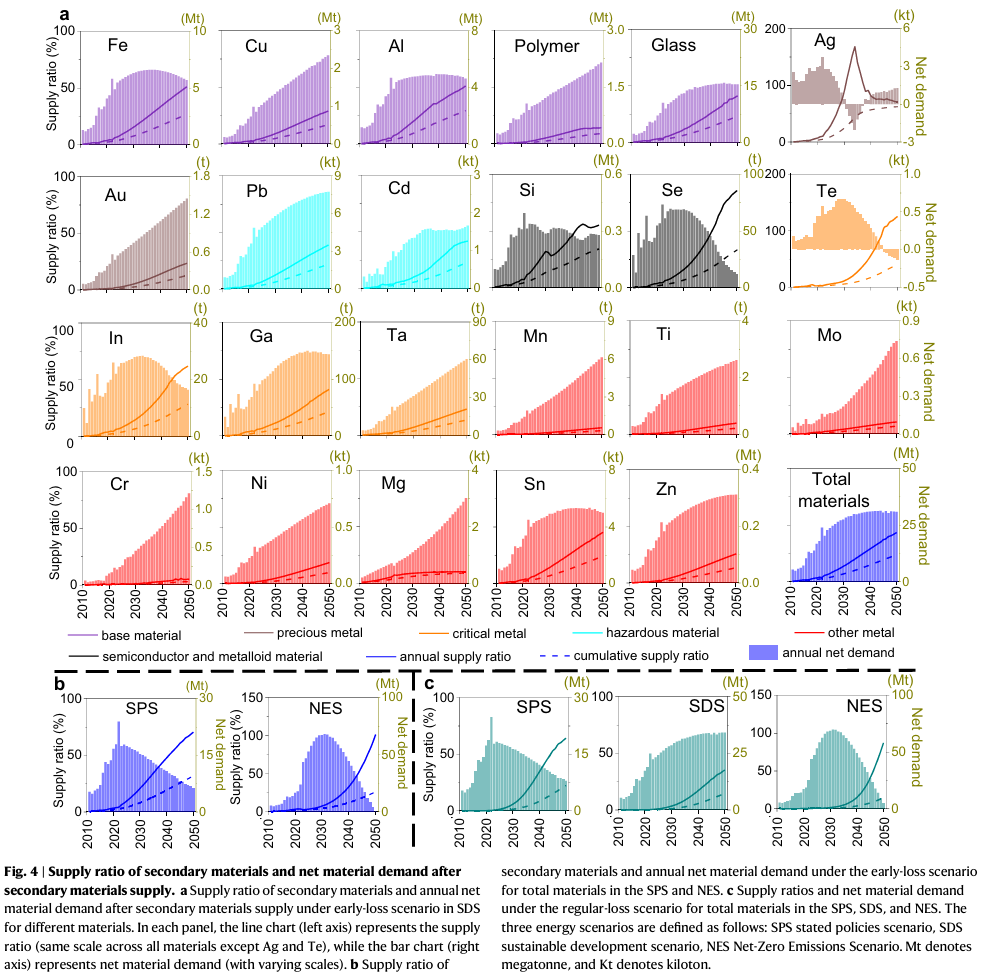 - 二次材料供应潜力巨大:到2050年,光伏系统回收材料可满足43.4%–101.6%的年材料需求,其中银和碲甚至可能出现供应过剩。