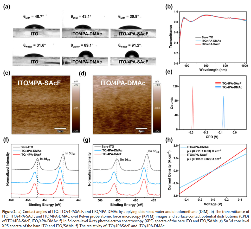 - 螺环分子结构优势:设计合成螺环构型自组装分子4PA-SAcF,具有更大偶极矩、更深HOMO能级和更强界面吸附能力,显著提升空穴提取与传输性能。