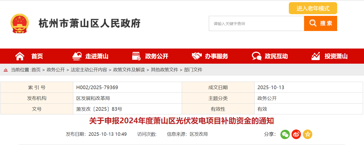 10月13日,浙江杭州市萧山区人民政府发布关于申报2024年度萧山区光伏发电项目补助资金的通知。