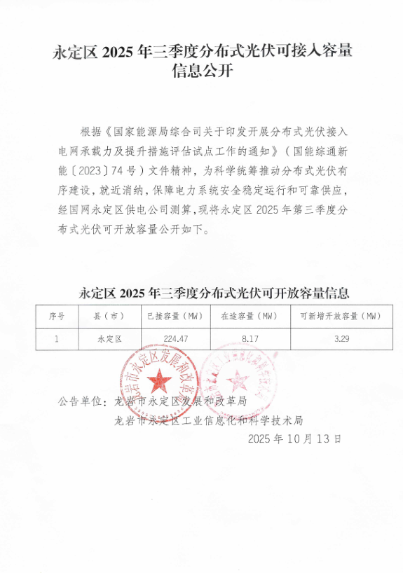 10月14日,福建省龙岩市永定区披露 2025 年三季度分布式光伏接入容量信息,其中可新增开放容量 3.29MW,已接容量为 224.479MW。