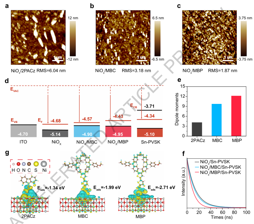 - 新型分子MBP实现均匀界面与能级对齐:MBP在NiOₓ表面形成超平整分子层(粗糙度仅1.87 nm),显著提升能级匹配度与空穴提取效率,克服传统分子(如2PACz)覆盖不均的问题。