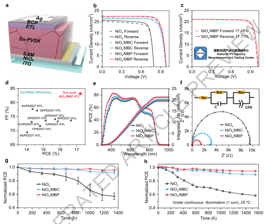 本研究南京理工大学徐勃、复旦大学梁佳和上海交通大学戚亚冰等人设计并采用了一种新型分子(MBP),在NiOₓ空穴传输层上形成均匀的分子薄膜,优化了界面能级对齐,显著提升了空穴提取效率。此外,该分子层形成超润湿底层,引导高质量、均匀的锡基钙钛矿薄膜生长,降低了缺陷密度与非辐射复合损失。基于此,倒置小面积TPSCs实现了17.89%的记录效率(认证效率17.71%),封装器件在1344小时环境储存后仍保持95%以上初始效率,在1550小时连续光照运行后仍保持94%以上。