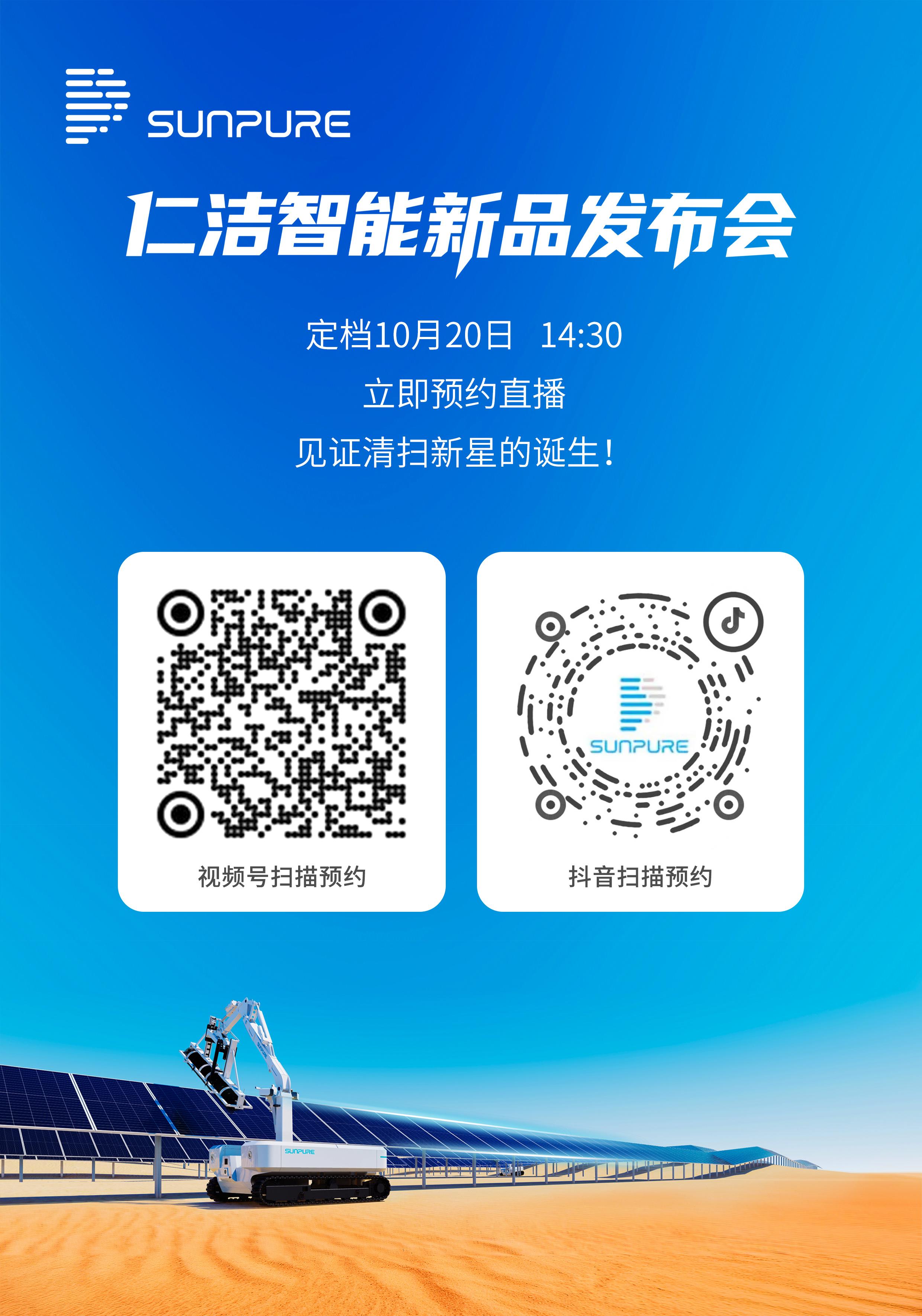 新品发布会将在10月20日 14:30举办,诚邀行业伙伴与朋友们扫码预约直播,共同见证光伏清扫新星诞生!