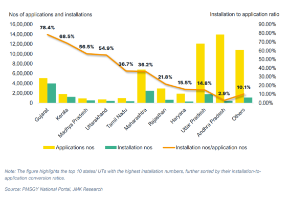 然而,截至2025年7月,仅完成了1000万套安装目标的13.1%,分配的657 亿印度卢比(约合75亿美元)补贴也仅发放了14.1%。实际上,截至2025年7 月,PMSGY计划下的全国安装申请转化率仅为22.7%,这凸显了将需求转化为实际屋顶太阳能装机容量所面临的挑战。