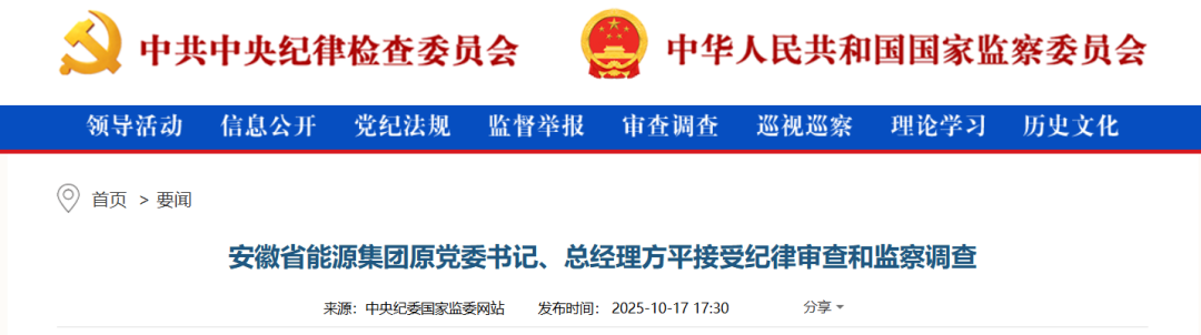 中央纪委国家监委网站10月17日消息,据安徽省纪委监委消息:安徽省能源集团原党委书记、总经理方平涉嫌严重违纪违法,目前正接受安徽省纪委监委纪律审查和监察调查。