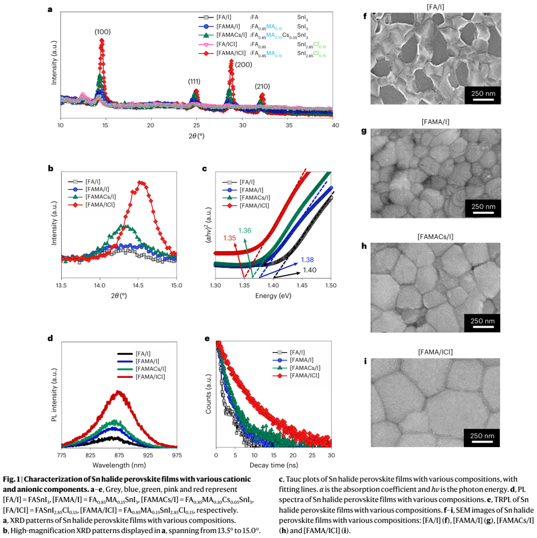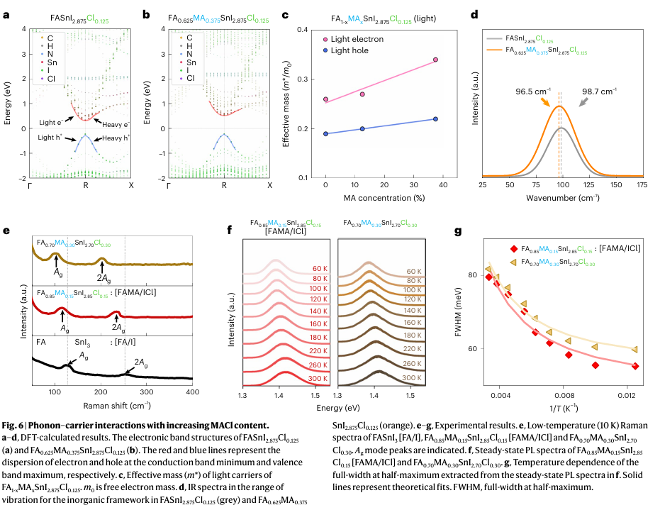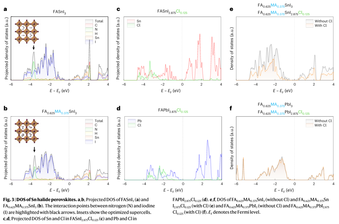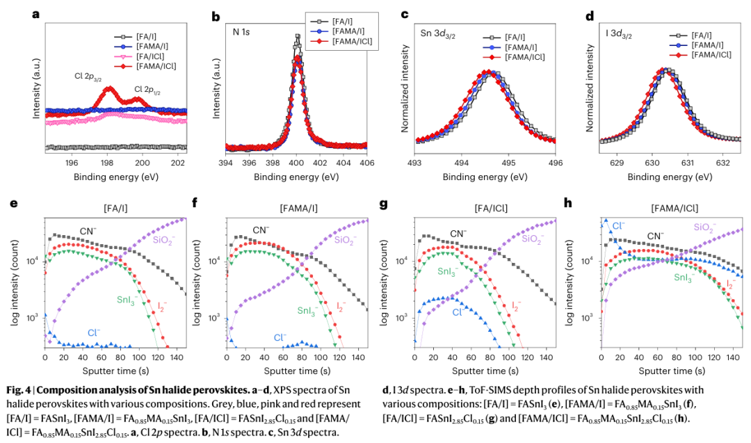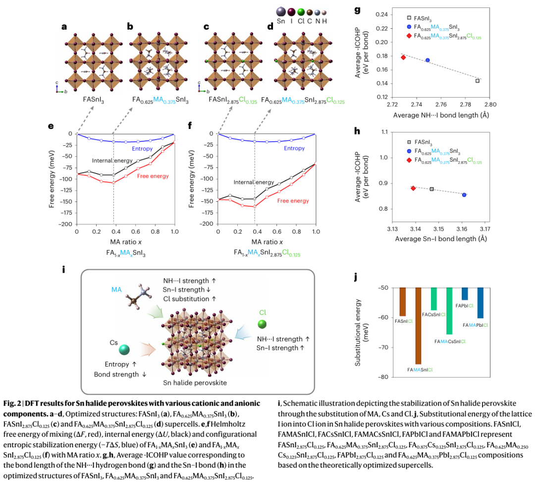 - 协同稳定与缺陷抑制:MA增强NH–I氢键并提升构型熵,Cl进一步强化Sn–I键并抑制碘空位形成,二者协同降低缺陷密度,提升器件稳定性与可靠性。