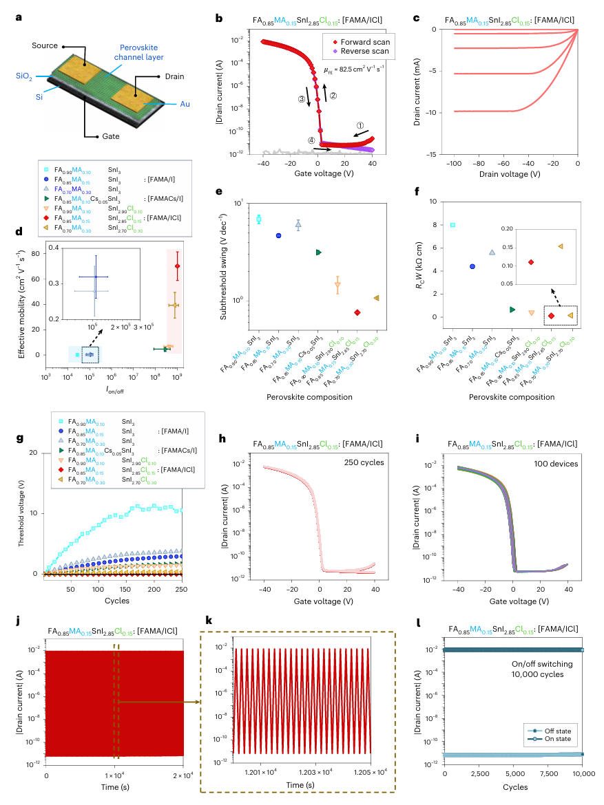 基于MACl取代的FASnI₃晶体管表现出超过80 cm² V⁻¹ s⁻¹的场效应空穴迁移率、超过3.0 × 10⁹的开关电流比、接近0 V的阈值电压,并具备高操作可靠性和无滞后行为。