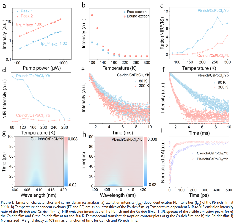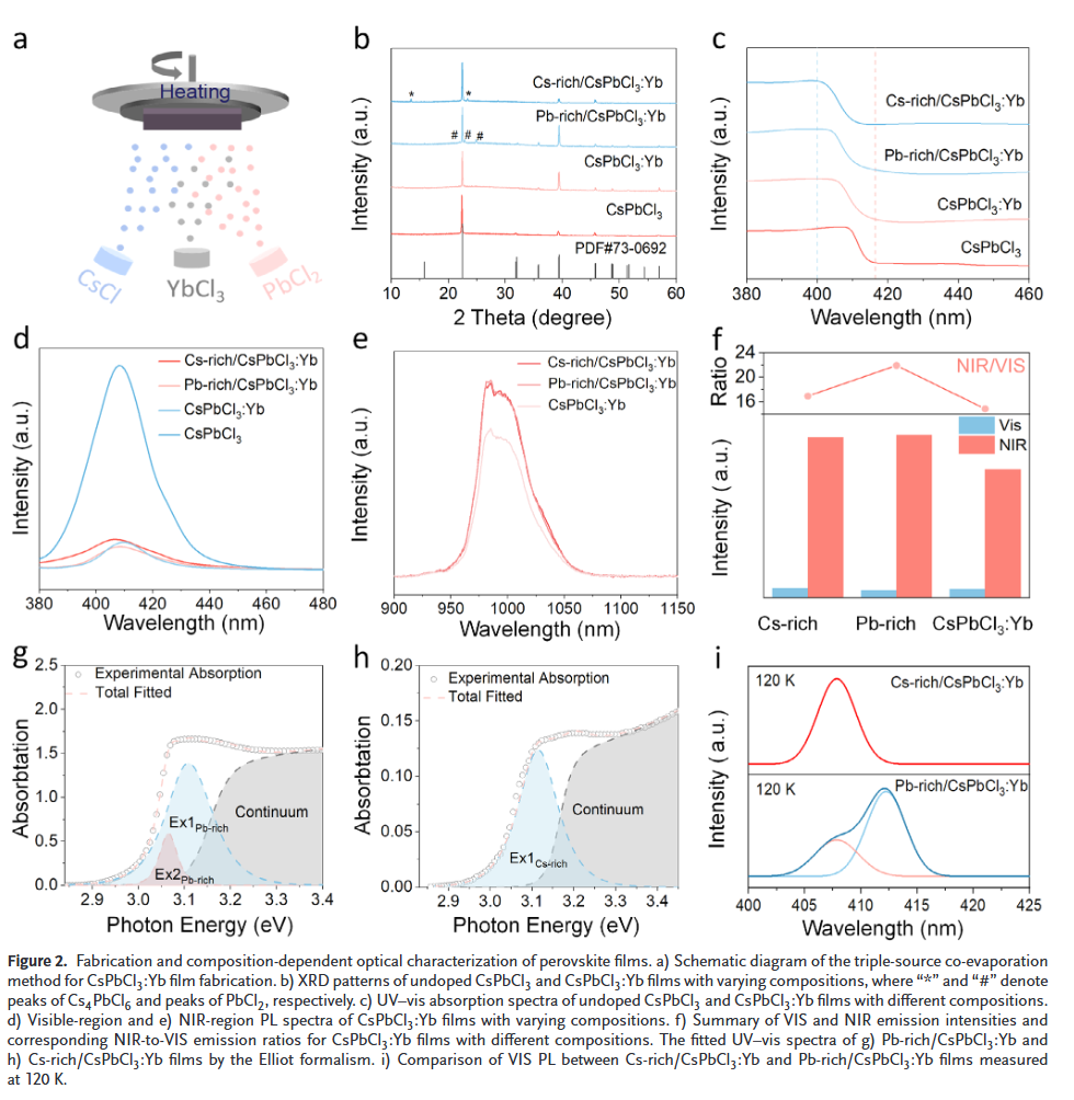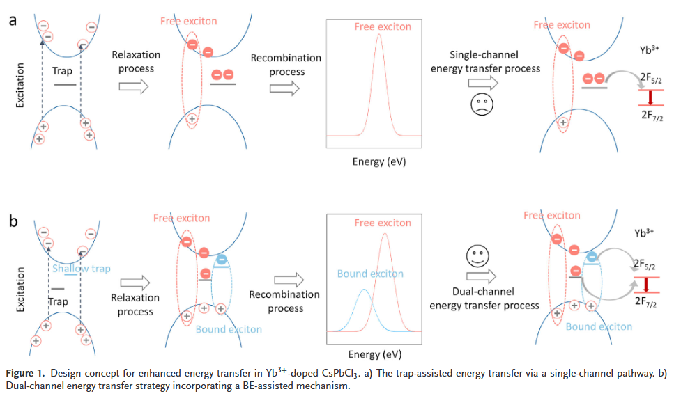 - 提出新型激子能量转移机制:首次在热蒸发Yb掺杂CsPbCl₃薄膜中发现束缚激子辅助的能量转移通道,突破了传统单一缺陷辅助能量转移的局限。