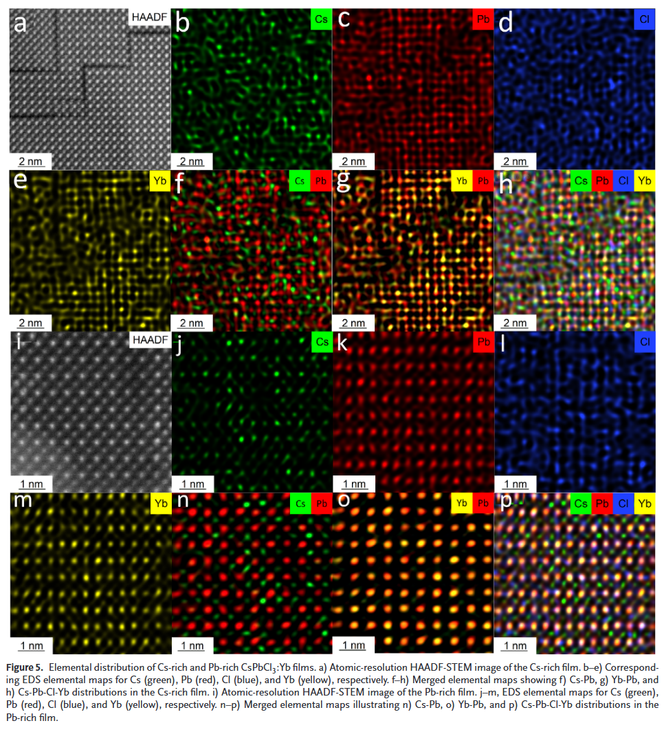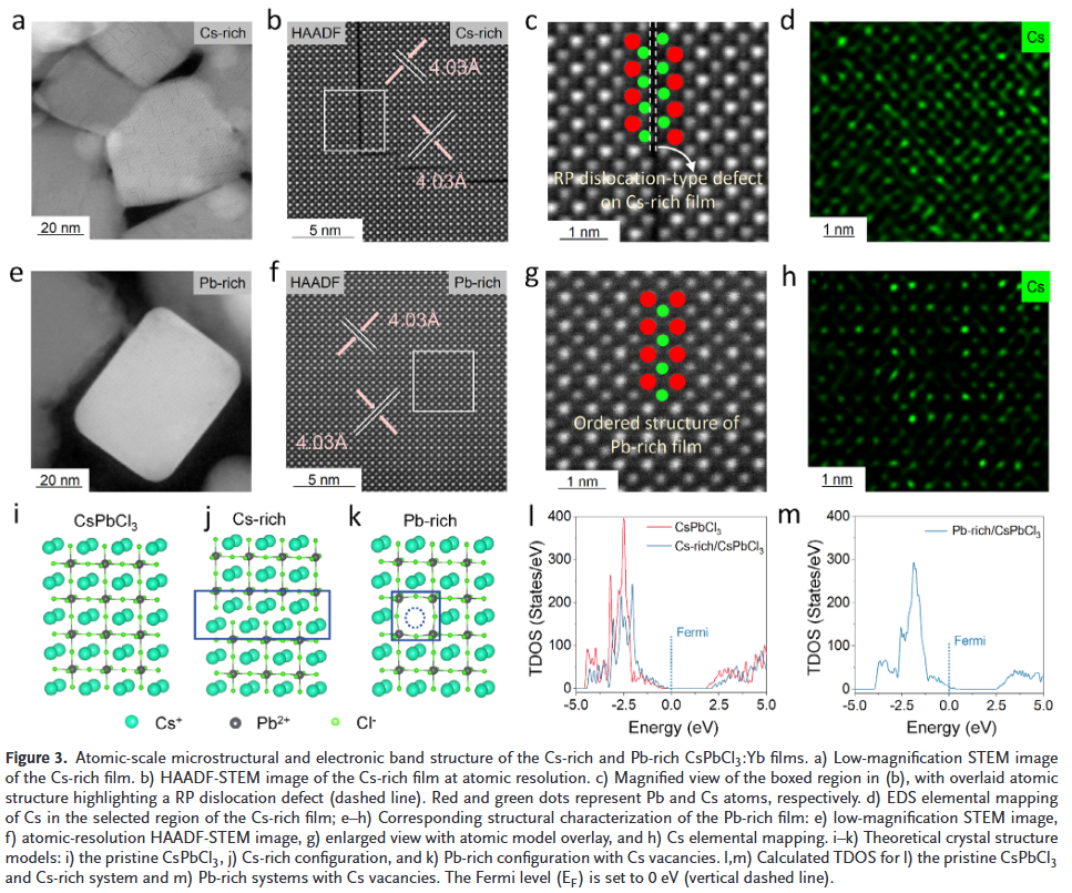 - 原子尺度揭示Cs空位关键作用:结合HAADF-STEM与第一性原理计算,证实Cs空位是诱导束缚激子形成并增强能量传递效率的关键结构因素。
