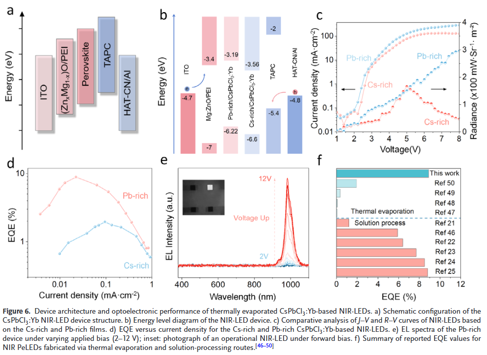 基于这一认识,我们成功制备出高性能近红外发光二极管,其外量子效率达8.9%,辐射亮度为410 mW·Sr⁻¹·m⁻²,标志着热蒸发近红外(>950 nm)发光二极管领域的重大突破。