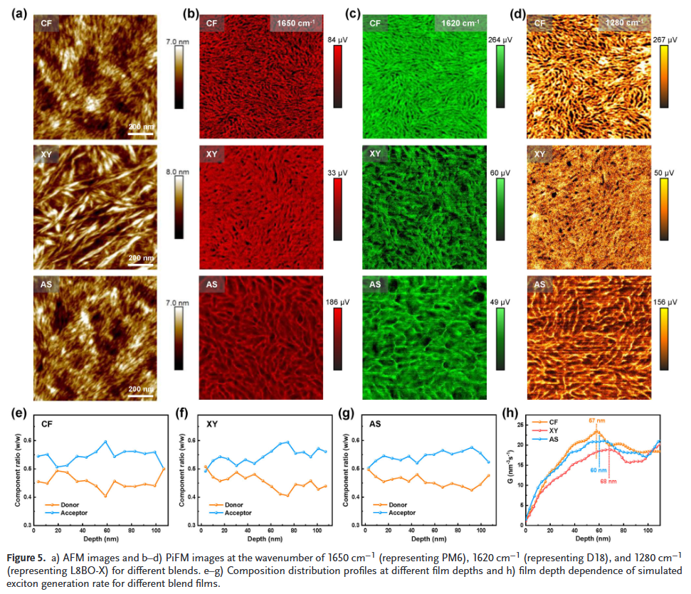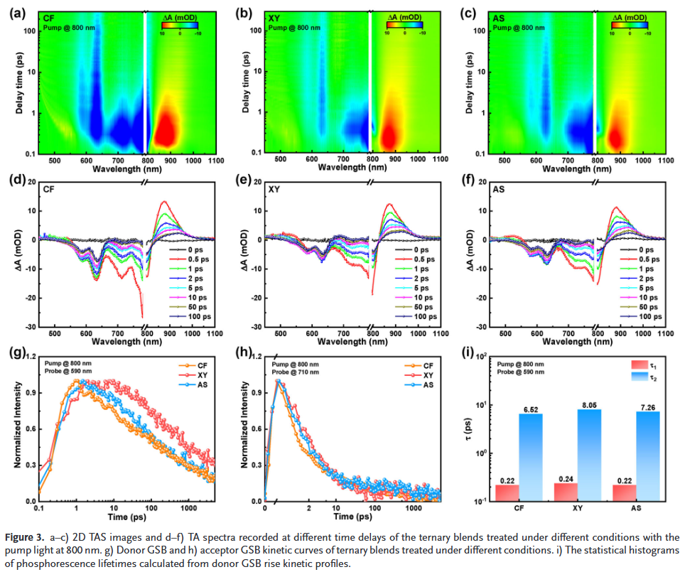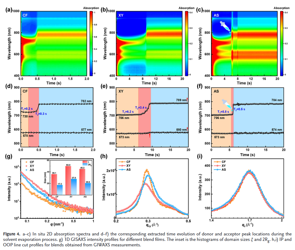 - 多维形貌与动力学优化:通过原位光谱、GISAXS、GIWAXS等手段证实反溶剂处理细化纤维网络、增强分子堆叠、优化纵向相分布,显著提升激子解离与电荷传输效率。