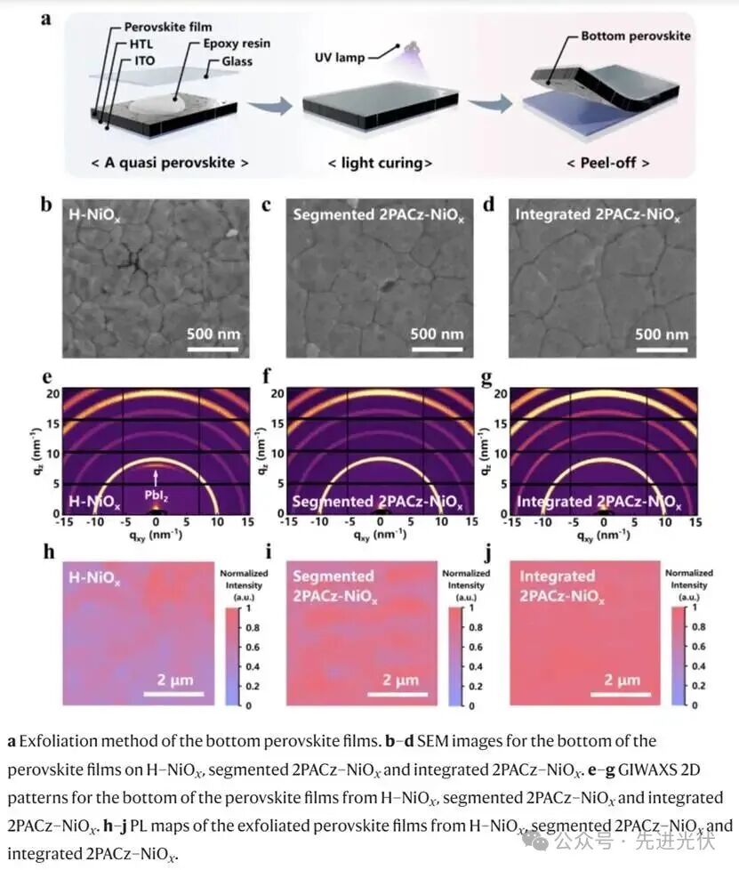 本研究通过环氧树脂辅助剥离技术揭示了钙钛矿在不同HTL基底上的结晶动力学差异。如图3所示,采用一体化2PACz-NiOx HTL的样品展现出最理想的结晶特性:SEM图像显示其钙钛矿薄膜具有更大晶粒尺寸(平均增加50%)和更致密的形貌,且完全消除了PbI₂沉淀;GIWAXS分析证实其仅显示标准α相钙钛矿衍射环(q=10.16/14.38/17.57/20.28 nm⁻¹),而传统H-NiOx样品在q=9.27 nm⁻¹处出现的PbI₂衍射环完全消失。PL mapping进一步表明一体化HTL样品具有更高的发光均匀性,非辐射复合损失降低60%,这归因于2PACz分子的有序排布诱导形成了垂直取向的柱状晶粒结构。这些发现为理解界面结晶机制提供了重要依据,证明一体化HTL能有效调控钙钛矿的成核与生长过程。