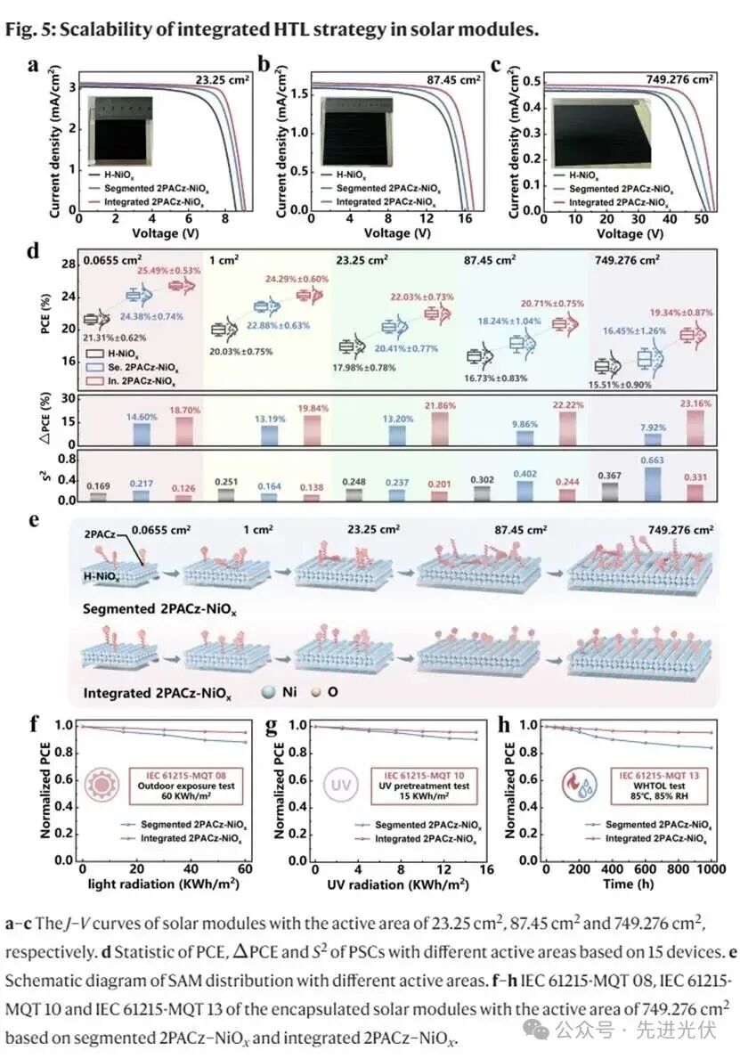 实现均匀稳定的空穴传输层(HTL)对大面积钙钛矿太阳能电池(PSCs)至关重要。然而,当前基于自组装单分子层(SAM)的HTL存在界面粘附力弱、薄膜均匀性差及稳定性有限等问题,制约了其规模化应用。本研究提出一种集成化HTL策略——在NiOx合成过程中进行原位SAM锚定,形成一类兼具可扩展性、高性能与高耐久性的HTL。该策略显著提升了分子有序度、能级匹配度及电荷提取效率,从而在大面积狭缝涂布模组中表现出更显著的性能提升。采用该HTL的PSCs实现了26.02%的冠军光电转换效率(活性面积为0.0655 cm²),大面积模组则分别获得22.80%(23.25 cm²)、21.45%(87.45 cm²)及20.21%(749.276 cm²,认证效率19.50%)的效率,展现出卓越的可扩展性。此外,该策略显著改善了辐照与热稳定性(商业化应用的关键挑战)。封装后的工业级模组成功通过了IEC 61215-2-2021标准中的三项模组质量测试(MQTs):户外暴露测试(MQT 08)、紫外预处理测试(MQT 10)及湿热工作寿命测试(MQT 13)。