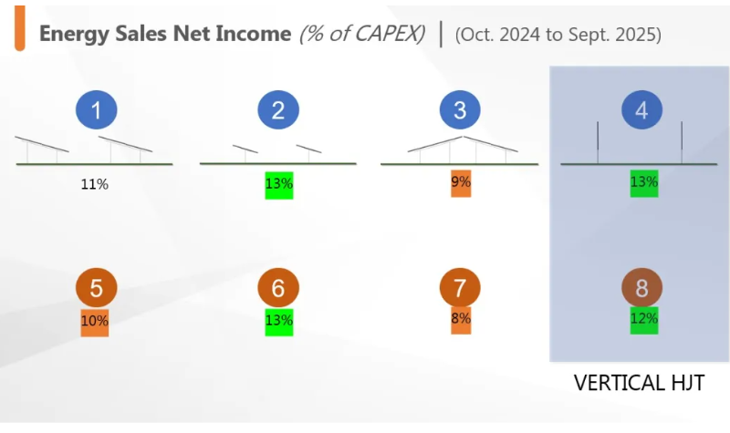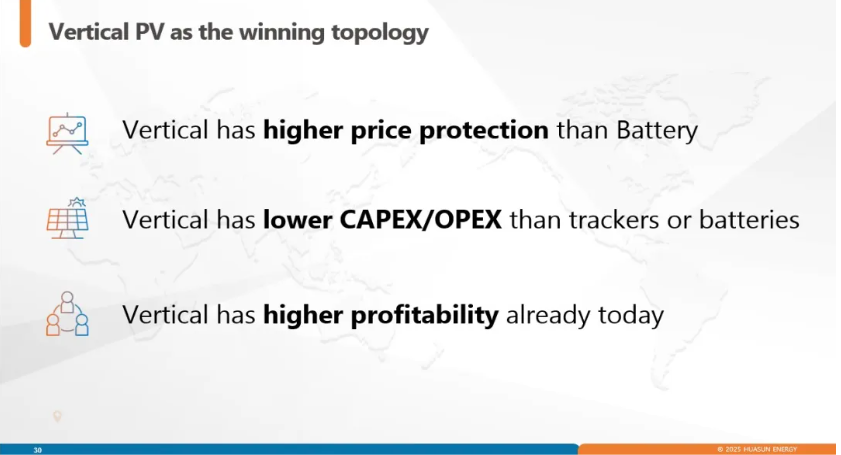 Christian Comes在演讲中创新性地引入“有无电池储能”作为关键变量,对包括朝南固定式、单轴跟踪式、东西穹顶式和垂直东西向在内的四种主流光伏拓扑结构进行了全方位经济性对比。通过专业模拟,从 CAPEX(初始投资)、OPEX(运营成本)、发电量到最终收益的量化分析显示,垂直安装展现出突出的综合优势。在德国市场的模拟中,垂直组件发电量较传统朝南固定式提升3%,能源销售收入高出20%,净收入回报率达到13%,与昂贵的跟踪支架系统相当。这一数据为电站投资提供了新的决策依据。同时,垂直安装是固定式结构,无移动部件,从根本上避免了跟踪支架的机械故障风险与更高的运维成本。