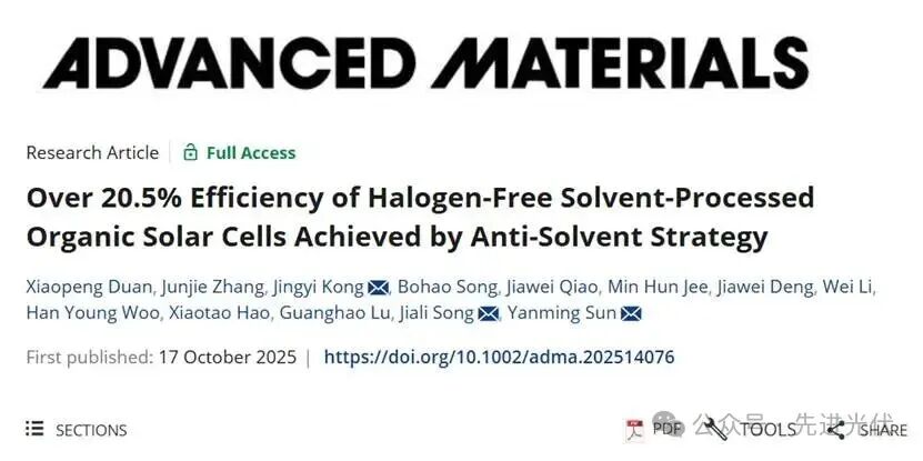 Duan, X., Zhang, J., Kong, J., Song, B., Qiao, J., Jee, M.H., Deng, J., Li, W., Woo, H.Y., Hao, X., Lu, G., Song, J., Sun, Y. Over 20.5% Efficiency of Halogen‐Free Solvent‐Processed Organic Solar Cells Achieved by Anti‐Solvent Strategy.Adv. Mater. 2025, e14076.https://doi.org/10.1002/adma.202514076