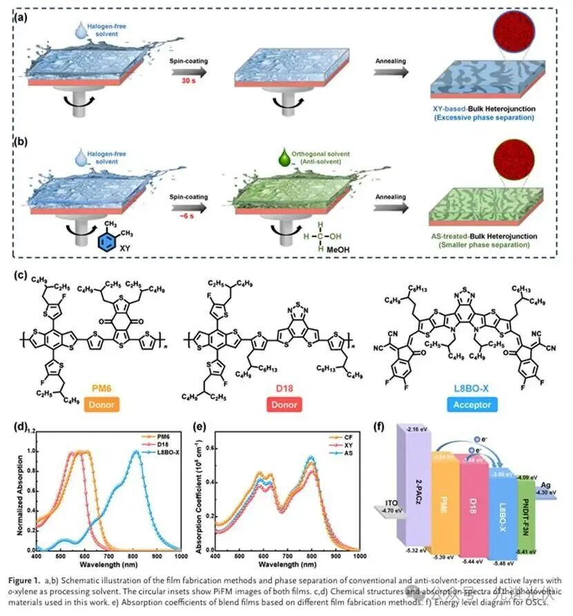 该图对比了传统溶剂(o-二甲苯)与反溶剂(甲醇)处理的活性层成膜机制差异。通过示意图和吸收光谱分析,甲醇作为反溶剂能加速材料沉淀,抑制分子过度聚集,优化相分离形貌。图中还展示了关键材料PM6、D18和L8BO-X的分子结构与能级排列,为后续器件性能提升奠定基础。甲醇处理的薄膜吸收系数显著提高,证明其更高效的激子生成能力。