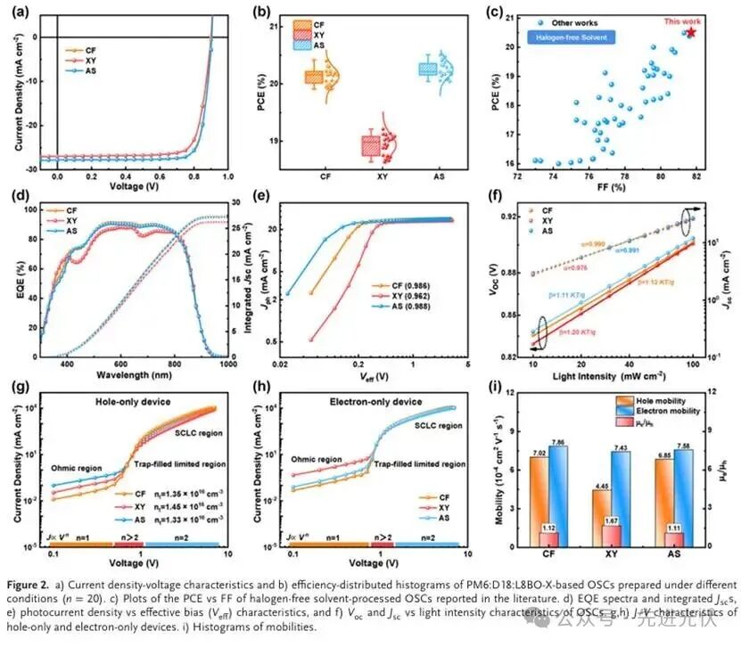 ✅效率突破:PM6:D18:L8BO-X体系在无卤溶剂中实现20.51%效率,为当前最高水平之一。