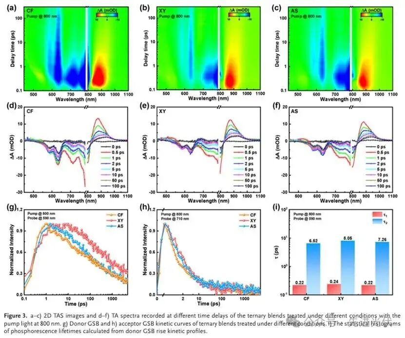 瞬态吸收光谱揭示了反溶剂处理对激子行为的调控机制。800nm泵浦光激发下,甲醇处理的薄膜表现出更快的空穴转移动力学(τ₁=0.38ps),供体基态漂白信号(GSB)提前出现,受体GSB衰减加速。双指数拟合显示激子解离寿命(τ₁)和扩散寿命(τ₂)分别缩短至0.38ps和2.14ps,证明反溶剂处理优化了给体/受体界面电荷分离效率。