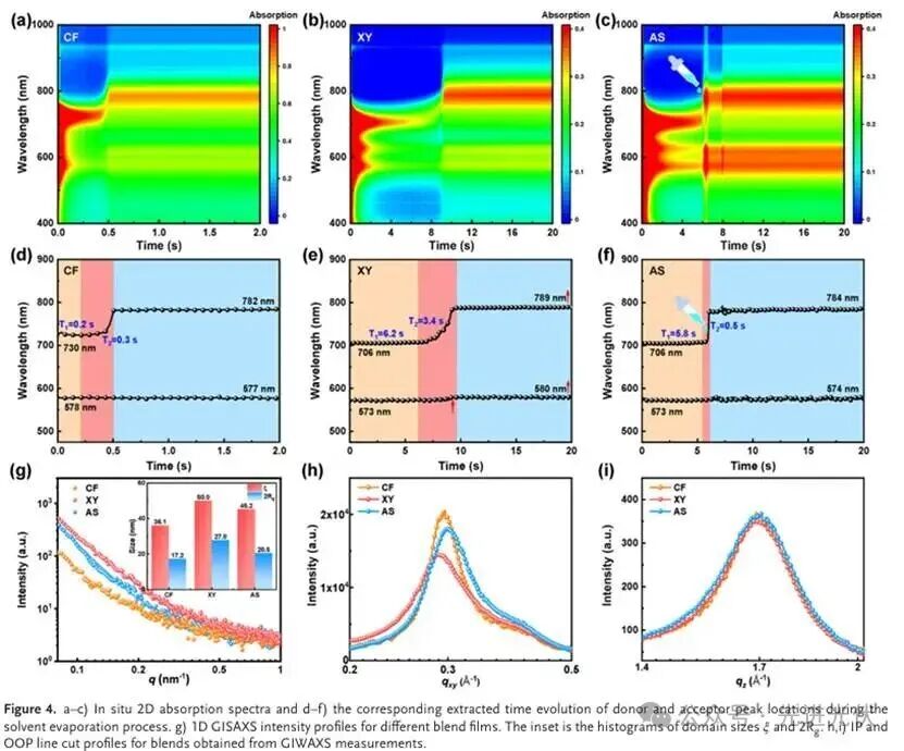 原位吸收光谱实时捕捉了薄膜结晶动态:传统o-二甲苯处理需3.4秒完成分子聚集(吸收峰红移至789nm),而反溶剂介入将聚集时间压缩至0.5秒(峰位蓝移至784nm)。GISAXS分析显示相区尺寸从27.8nm缩减至20.5nm,GIWAXS证实(100)晶面间距从21.67Å降至21.01Å,π-π堆叠距离从3.71Å优化至3.70Å,形成更紧密的face-on取向晶体结构。