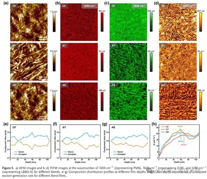 AFM和光诱导力显微镜(PiFM)显示反溶剂处理使纤维状网络结构更精细(表面粗糙度Rq从1.372nm降至1.134nm)。深度依赖吸收谱证实L8BO-X在阳极侧浓度从56.1%降至52.4%,抑制了受体过度聚集。激子生成速率模拟表明反溶剂薄膜的激子生成中心向活性层中部迁移(从68nm移至60nm),缩短电荷提取距离,减少复合损失。