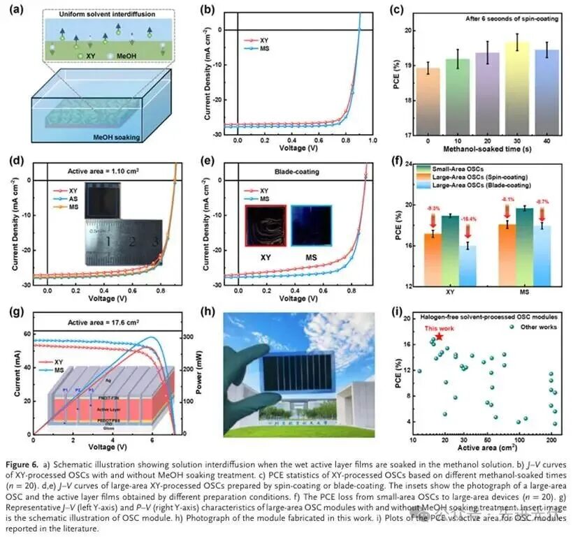甲醇浸泡技术将反溶剂策略拓展至大面积制备,17.06cm²模块效率达17.23%。插图对比显示浸泡处理有效抑制"咖啡环效应",刀刮涂布器件效率从17.69%提升至18.85%。性能统计表明从小面积(0.1cm²)到模块(17.6cm²)的效率损失从12.3%降至6.1%,验证了该策略的规模化应用潜力,创无卤溶剂处理OSC模块效率纪录。