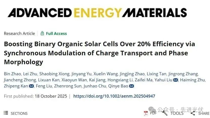 Zhao, B., Zhu, L., Xiong, S., Yu, J., Wang, X., Zhao, J., Tan, L., Zhang, J., Zhong, J., Kan, L., Wan, X., Jiang, K., Li, H., Ma, Z., Liu, Y., Zhu, H., Kan, Z., Liu, F., Sun, Z., Chu, J., Bao, Q. Boosting Binary Organic Solar Cells Over 20% Efficiency via Synchronous Modulation of Charge Transport and Phase Morphology.Adv. Energy Mater. 2025, e04947.
