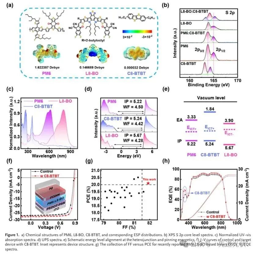 该图系统展示了PM6、L8-BO和C8-BTBT的分子结构及静电势分布特征,通过XPS和UPS能谱分析揭示了C8-BTBT与L8-BO之间的静电相互作用机制。能级排列示意图显示PM6的E1CT+(4.5 eV)高于L8-BO的E1CT-(4.28 eV),有效避免了界面陷阱复合。器件性能数据表明,添加C8-BTBT后效率从18.4%提升至20.1%,FF达到81.9%的创纪录水平,EQE光谱验证了300-400 nm波段的吸光增强贡献。