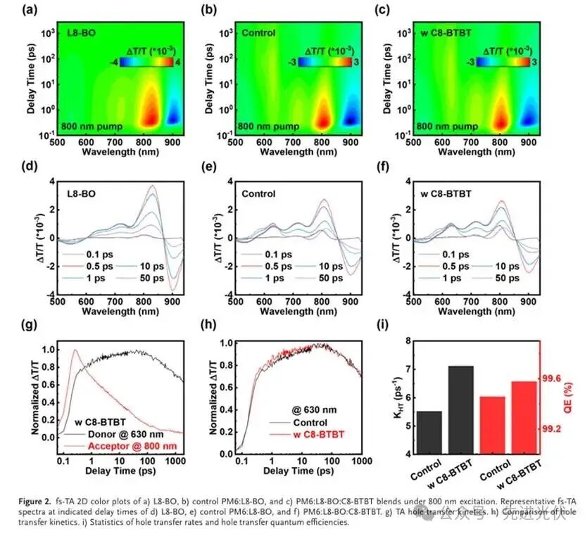 通过800 nm激发的瞬态吸收光谱,观察到C8-BTBT修饰的混合膜中L8-BO在750-850 nm的漂白峰衰减更快,对应PM6在550-650 nm的基态漂白信号加速上升。动力学分析显示激子解离时间从119 fs缩短至93 fs,扩散时间从4.01 ps降至2.34 ps,空穴转移量子效率提升至92%,为高FF提供了动力学基础。