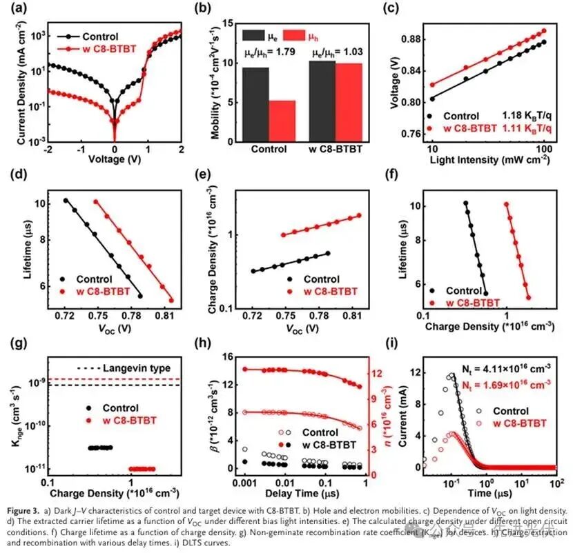 暗电流测试显示器件串联电阻降低47%,SCLC测得更平衡的迁移率(μh/μe=1.03)。光强依赖性Voc分析表明非辐射复合显著抑制,TPV/TPC测试证实载流子寿命延长1.8倍。DLTS谱显示陷阱态密度从4.11×10¹⁶ cm⁻³降至1.69×10¹⁶ cm⁻³。