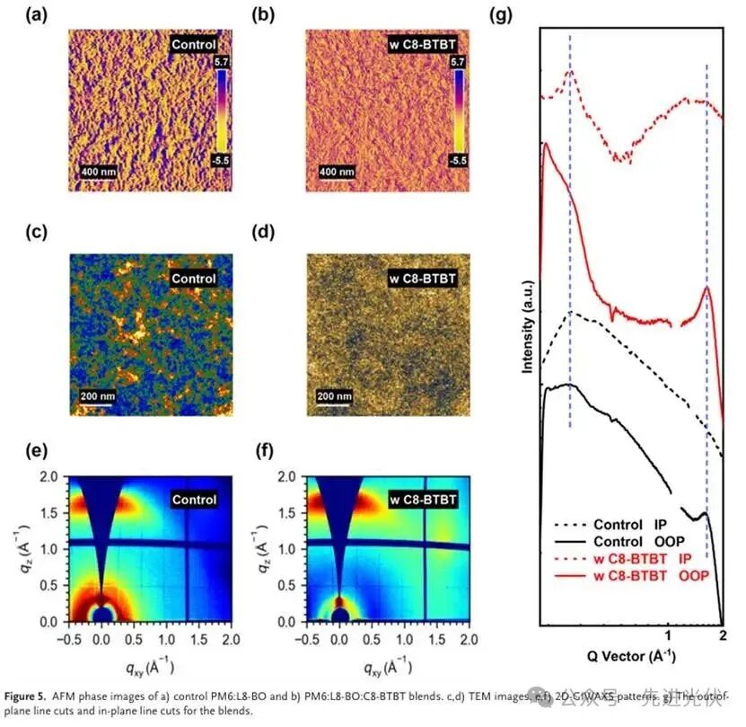 3.形貌精细调控:C8-BTBT增强给受体相容性,形成均匀纤维互穿网络,π-π堆叠距离缩短至3.78 Å,结晶相干长度显著提升。