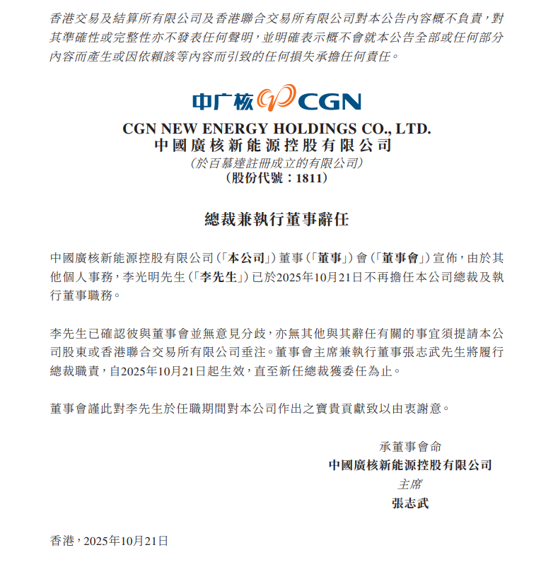 10月21日,中广核新能源(01811)发布公告,由于其他个人事务,李光明先生已于2025年10月21日不再担任公司总裁及执行董事职务。