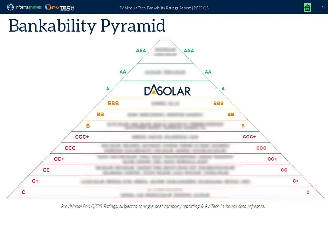 近日,全球权威光伏行业分析机构PV Tech发布《2025年第三季度光伏组件制造商可融资性评级报告》,一道新能凭借在N型技术领域的持续突破、稳健的财务表现及全面深入的全球化战略布局,再度蝉联A级评级,不仅彰显了一道新能在全球新能源市场中的综合竞争力,也进一步巩固了其作为行业技术引领者的地位。