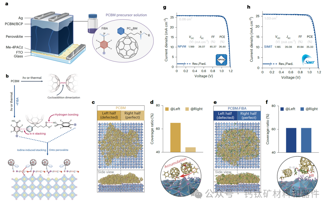 (a)钙钛矿电池结构及添加剂分子示意图;(b)PCBM电子传输材料二聚化及添加剂作用机理;(c-f)分子动力学模拟结果示意图;(g-h)太阳电池器件效率