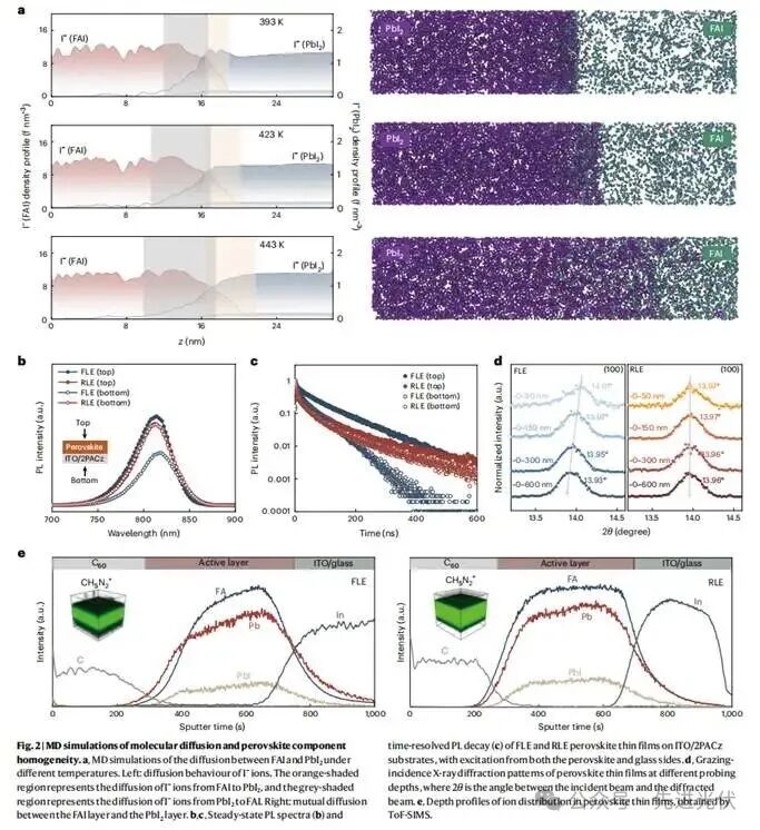 图a的MD模拟显示,温度对FAI与PbI2之间的相互扩散具有显著影响,随着温度升高,密度分布曲线变得更加弥散,表明热能为离子扩散提供了动力。图b和c的稳态PL和TRPL数据表明,RLE薄膜在从钙钛矿侧和玻璃侧激发时表现出相似的PL强度和激子寿命,证明了其优异的垂直均匀性。图d的GIXRD进一步证实了FLE薄膜存在成分梯度现象。图e的ToF-SIMS深度剖析显示,RLE薄膜的FA和Pb信号在钙钛矿区域内变化极小,纵向均匀性显著优于FLE薄膜,这归因于RLE方法促进了前驱体的充分扩散和反应。