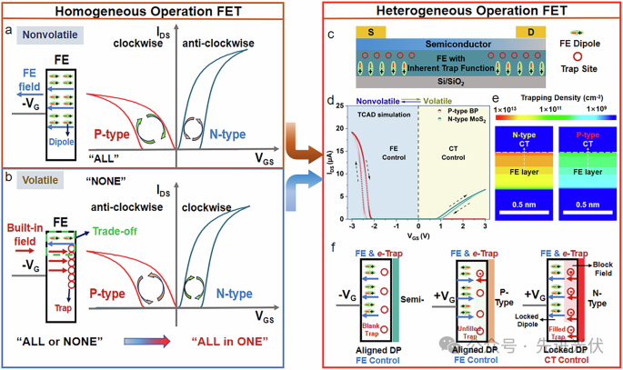 极性依赖铁电调控机制:通过设计铁电层中的电子俘获位点与半导体载流子类型的耦合,实现n型器件中电荷俘获主导与p型器件中铁电极化主导的宏观电滞行为。