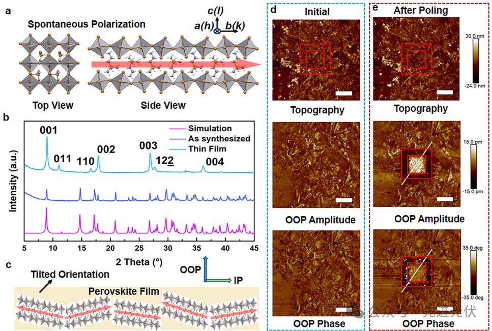 图2组 系统表征了二维杂化钙钛矿铁电材料ETPB的晶体结构与铁电性能:XRD图谱显示薄膜具有(001)取向的Dion-Jacobson相结构,且晶体相对衬底呈倾斜排列,PFM测量证实其存在垂直与水平方向的自发极化,通过"盒中盒"扫描实验观测到±12V偏压可翻转铁电畴,结合P-E回线测试获得1.1μC/cm²的剩余极化强度,证明该材料在室温下具有稳定的铁电性。