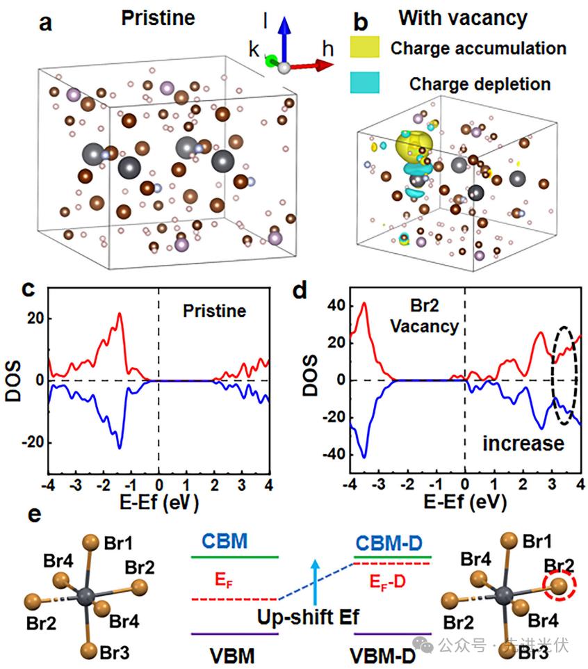 图3组 基于DFT计算揭示了ETPB中溴空位固有的电子俘获特性:差分电荷密度图显示Br空位处存在明显的电荷积累,态密度计算表明溴空位会在导带底引入俘获能级,导致费米能级上移并形成带隙内的电荷态,这种本征电子俘获位与铁电性的耦合为实现功能化器件提供了理论基础。