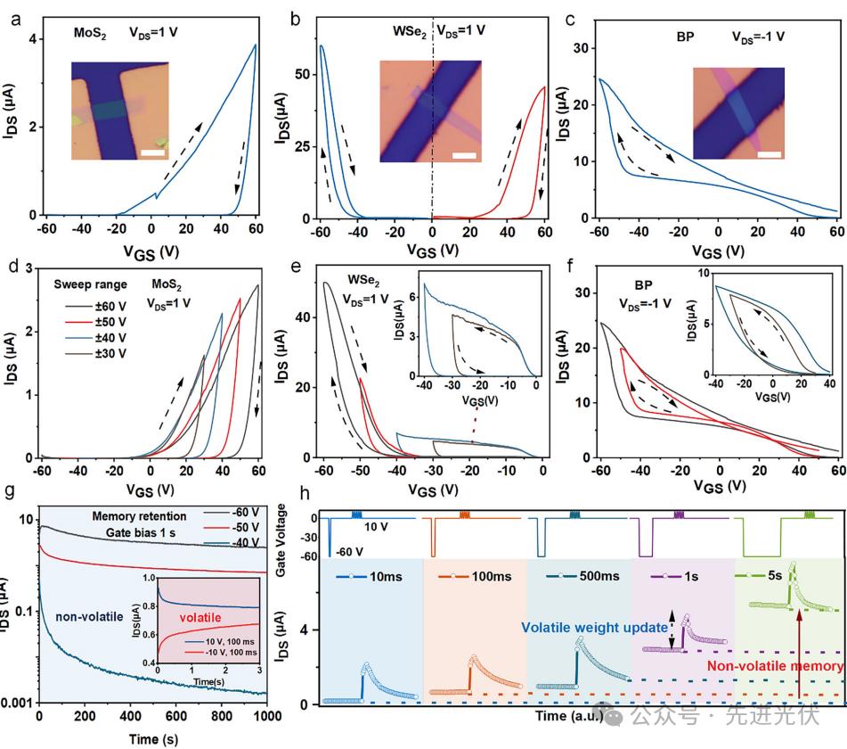 双极器件异构操作:在WSe₂基双极晶体管中,p区表现为铁电调控,n区表现为电荷俘获,实现了非易失性记忆与易失性权重更新的动态切换。