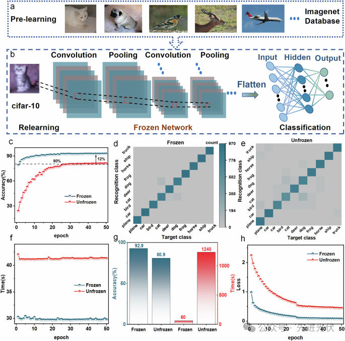 图5组 展示了基于二维铁电异质结晶体管的迁移学习神经网络模拟:通过冻结ImageNet预训练特征并结合CIFAR-10数据集进行再训练,网络在保留特征记忆的条件下仅需2个周期即可达到80%准确率,最终识别精度提升至92.9%,且训练效率提高20.7倍,混淆矩阵热图显示分类精度全面提升,证实铁电非易失记忆与电荷俘获易失权重更新的协同机制能显著增强神经网络性能。