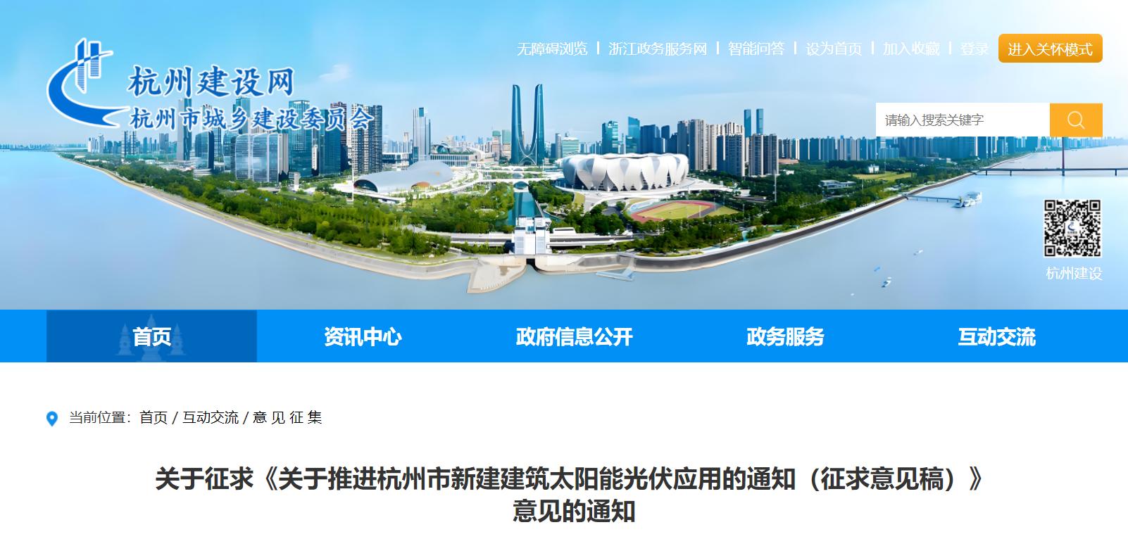 日前,浙江杭州市城乡建设委员会关于征求《关于推进杭州市新建建筑太阳能光伏应用的通知(征求意见稿)》意见的通知,通知规范民用建筑光伏建设管理。