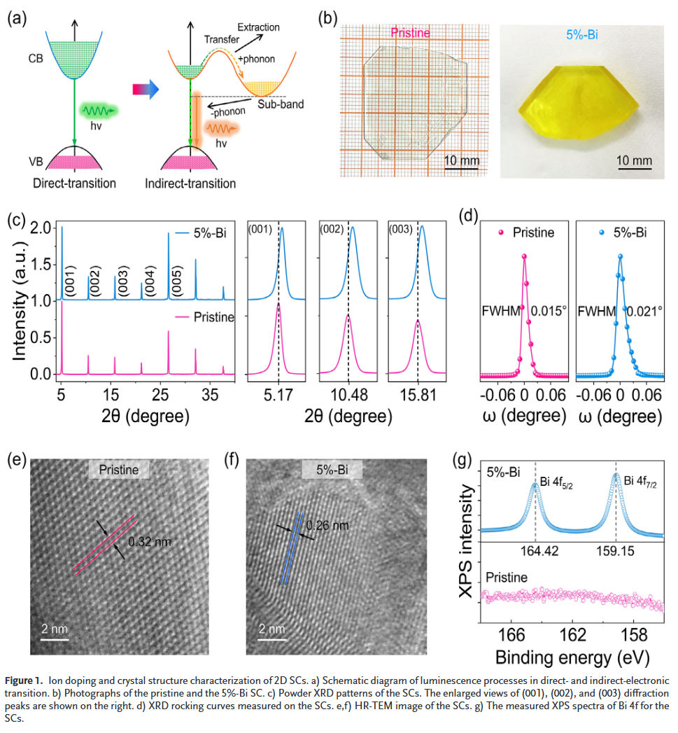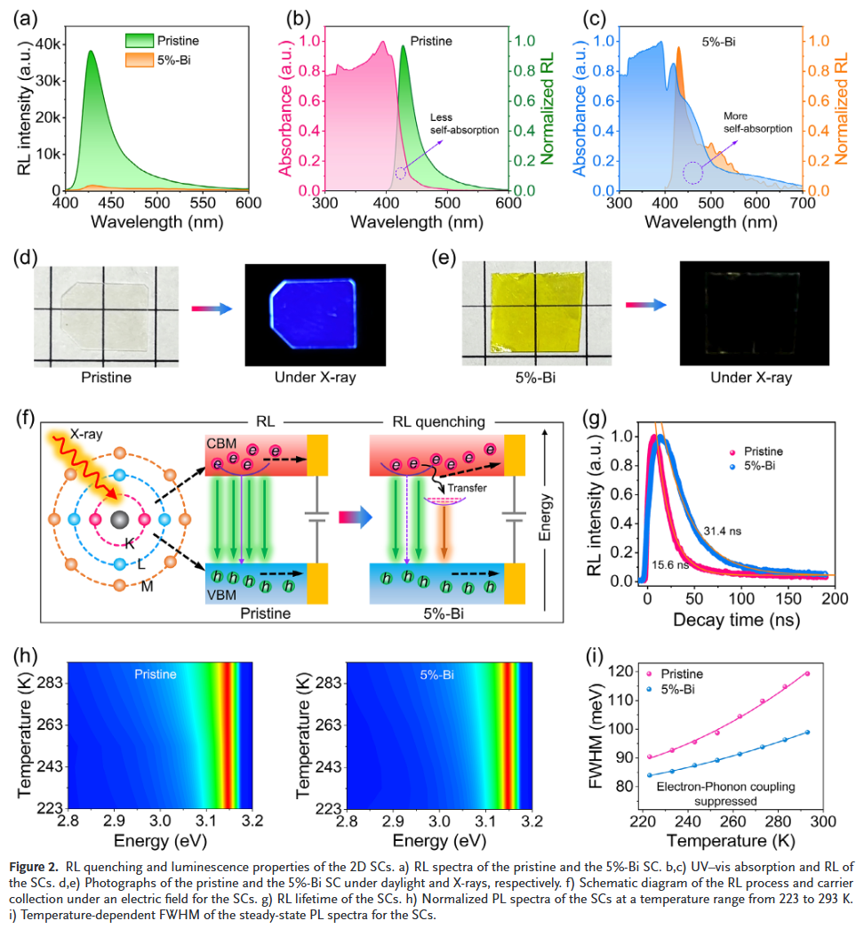 - Bi³⁺掺杂实现辐射发光淬灭:通过引入Bi³⁺离子,将二维钙钛矿PEA₂PbBr₄的直接带隙电子跃迁转变为间接跃迁,显著降低辐射发光效率,减少X射线探测过程中的能量损失。